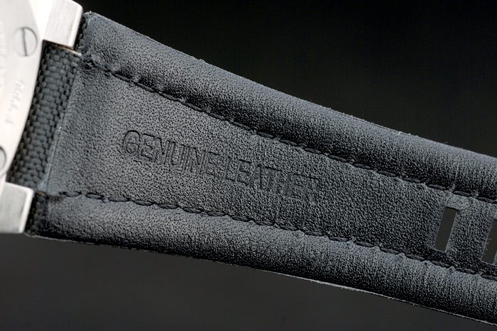 ケース:ロゴとオーデマピゲの熱エンボスレザーストラップが並ぶ黒生地はブラッシュ刻印ステンレス製のフッククラスプ