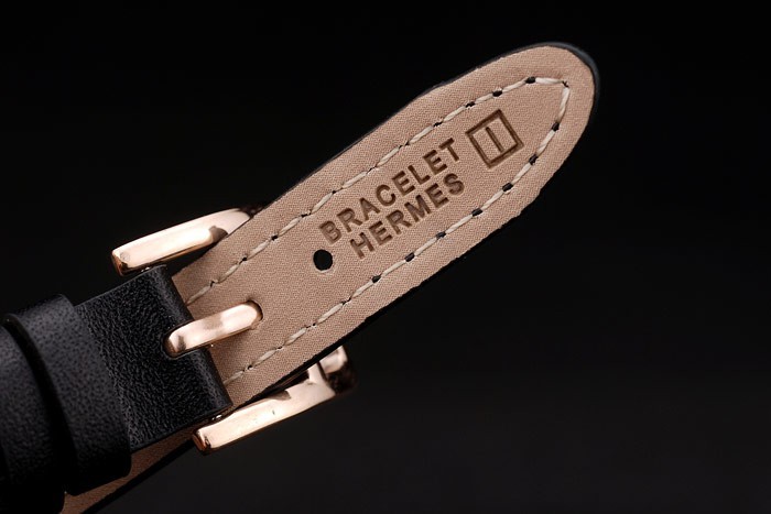 性別とバックダウンねじ込みメッキ:熱スタンプをエンボスを有する細長い黒革のストラップ及びヘルメスヘルメスブレスレットローズ金メッキフック、バックル留め