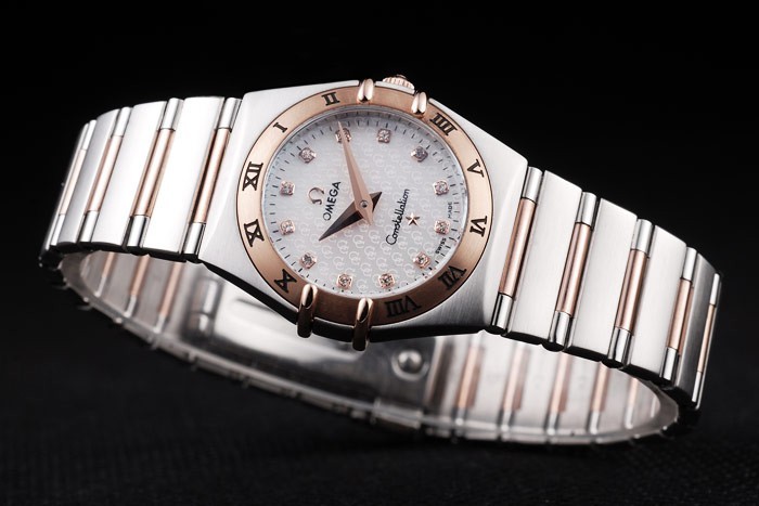 上に隠されたクラスプとオメガのロゴとローズゴールドのチェーンリンクブレスレット:ベゼル