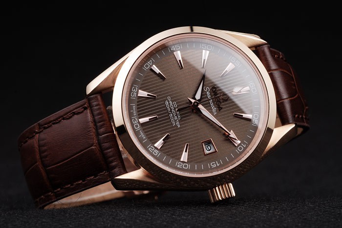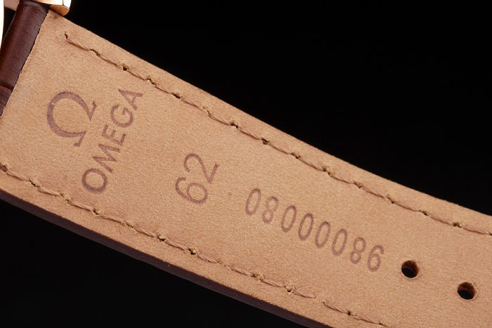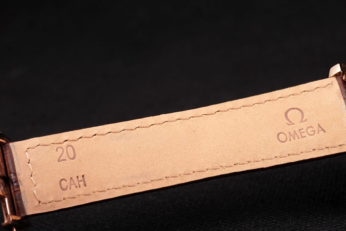 ローズ・ゴールドケース:熱とブラウンワニ革ストラップは、オメガスタンプをエンボス加工し、オメガは、18Kローズゴールド折り畳み式でブレスレットの長さ