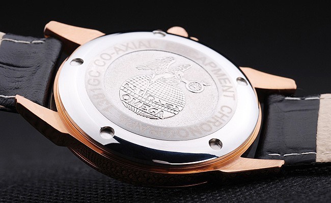 性別とケースの背面にねじ込ま>ブレスレット:ホワイトステッチとオメガのロゴ付きブラックワニ革ストラップイエローゴールドフック・バックルクラスプ