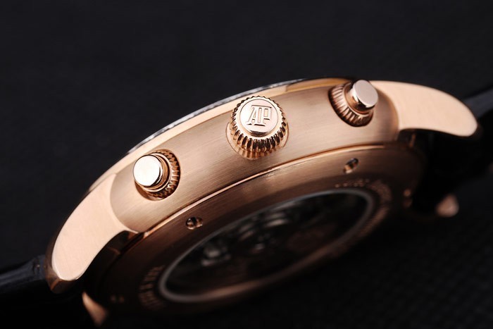ステンレス製のベゼルをちりばめました: 18Kローズゴールドをオーデマピゲのロゴとその両側に2つの小さなプッシュボタン冠を持つメッキカットワーク冠はケース厚を