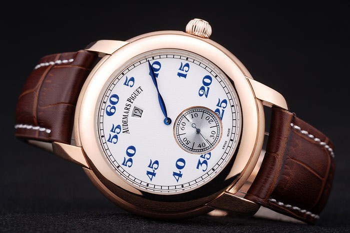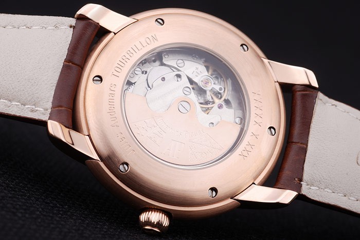 ステンレスケースをメッキ:ホワイトステッチ糸と熱とブラウンワニ革ストラップは、オーデマピゲの名称とロゴをエンボス加工し、オーデマピゲは、18Kローズゴールドメッキフリップオーバーフッククラスプ