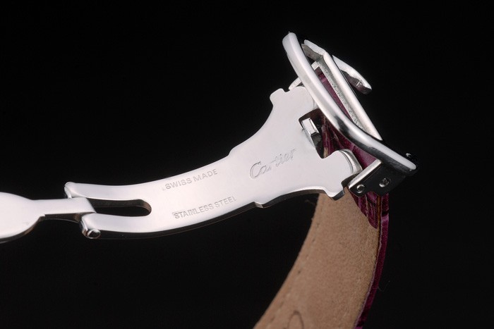 ポリッシュステンレススチールケース:カルティエ熱が紫エンボス研磨されたステンレス鋼とワニ革ストラップ倍-にクラスプバックル