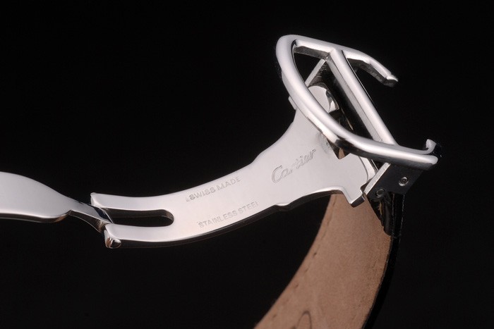 ポリッシュステンレススチールケース:カルティエ熱が黒のエンボス研磨されたステンレス鋼とワニ革ストラップ倍-にクラスプバックル