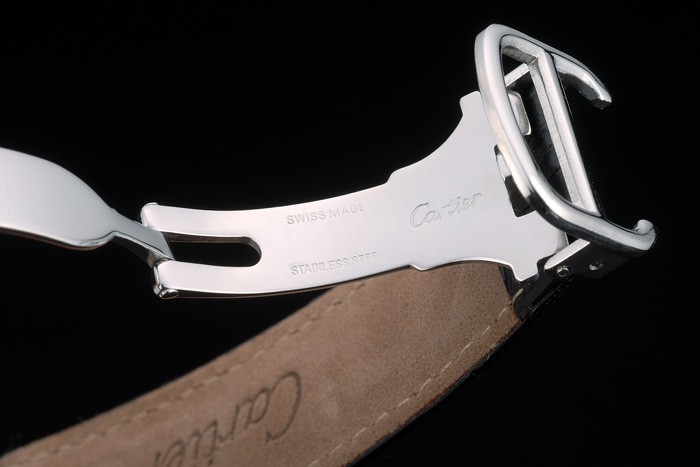 ポリッシュステンレススチールケース:カルティエ熱が黒のエンボス研磨されたステンレス鋼とワニ革ストラップ倍-にクラスプバックル