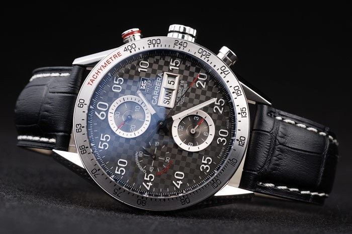スイスのタグホイヤーカレラタキメーターベゼルブラックレザーストラップブラウンチェッカーダイヤル