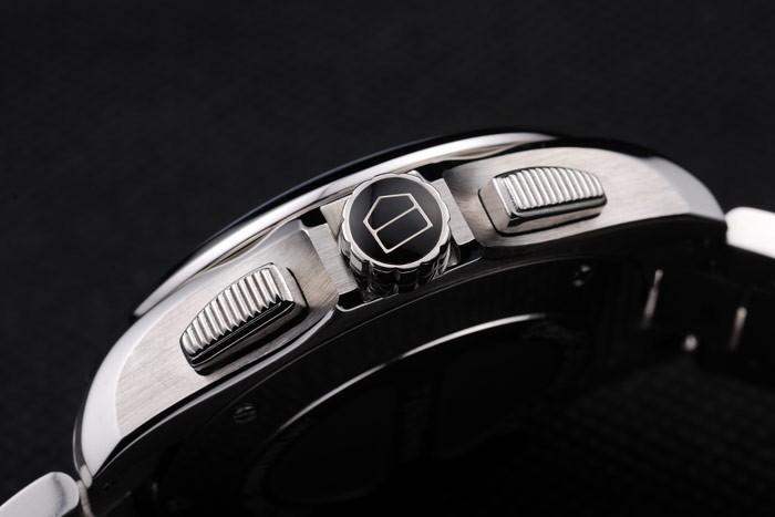 クラウン:タグホイヤーのロゴ黒のエナメルスタッド付きステンレススチールカットワーク冠とその両側にある2つの長いリブ付きプッシュボタン冠プラスケース厚