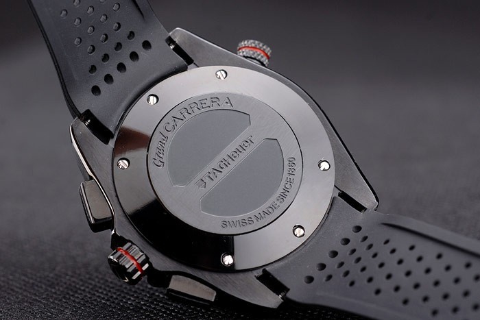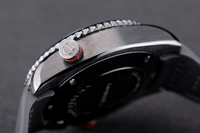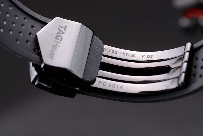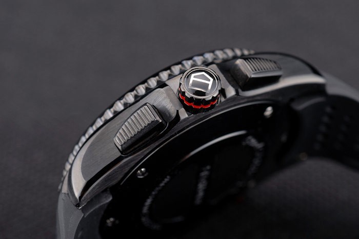 クラウン:赤帯とタグホイヤーのロゴと反対側のカットワーク王冠と一緒に、それのいずれかの側にある2つの長いカットワークプッシュボタン冠を持つイオンメッキカットワーク冠サイド