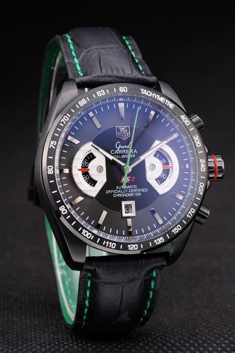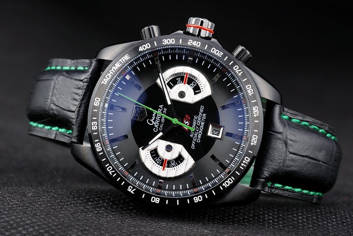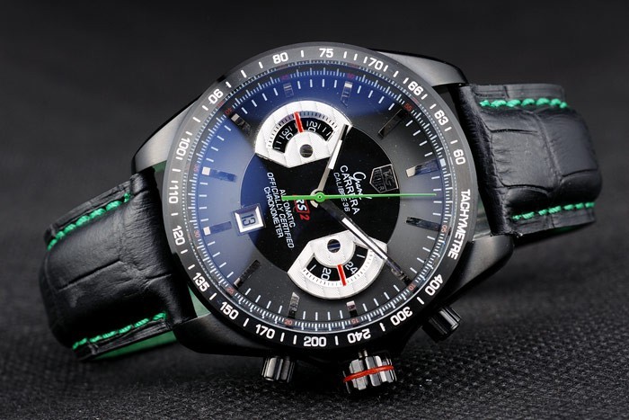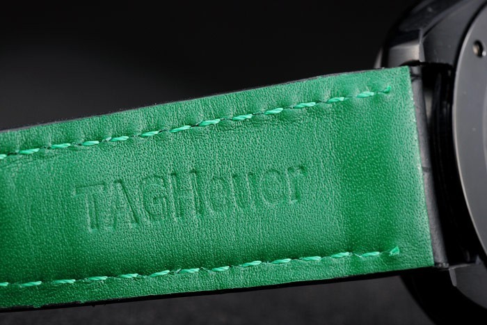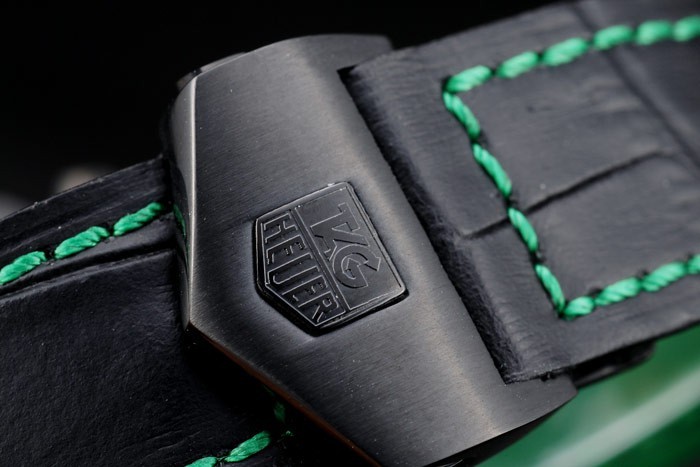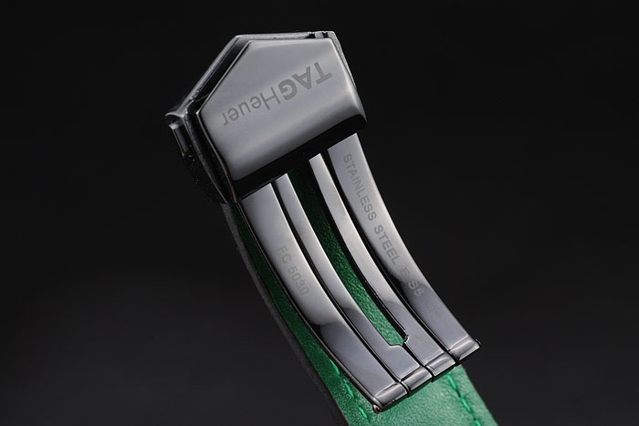 上にタグホイヤーのロゴ付きクラスプを超える倍グリーンのステッチ糸とイオンメッキプッシュリリースとタグホイヤーの黒ワニ革ストラップをエンボス加工しました:バンドタイプ