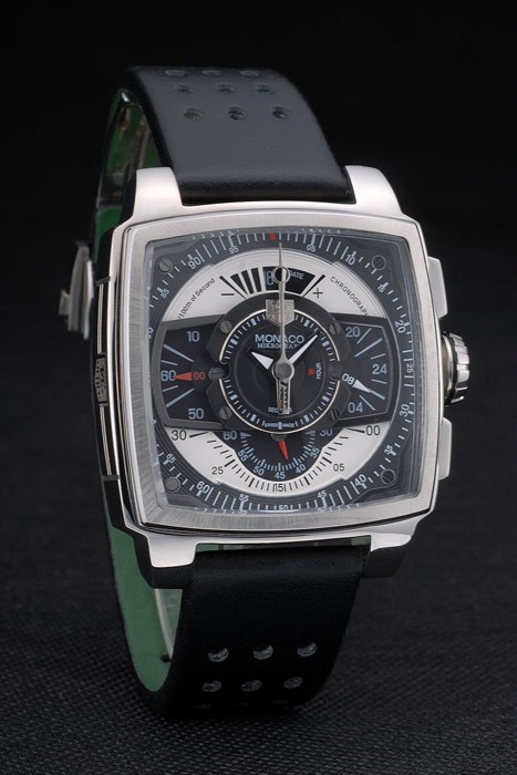 タグホイヤーモナコスイスのブラックレザーストラップブルー・イエローストライプブラックダイヤル