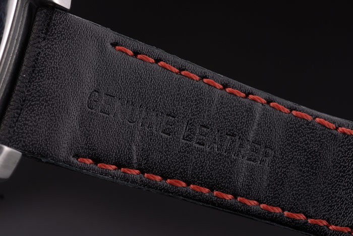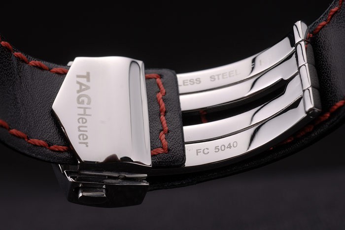 クォーツ(電池)内側とステンレス鋼の赤いステッチタグホイヤー黒の穴あきレザーストラップを折り、中留めプッシュリリース機能でブレスレットの長さ