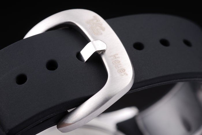 タグホイヤーの碑文とつや消しステンレススチールフックバックルクラスプ付ブラックラバーストラップブラッシュドステンレススチールベゼルタキメーター