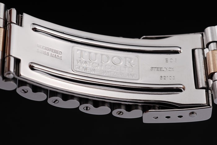 ステンレススチールケースをブラッシュ:2つはチューダー彫刻とプッシュリリースとステンレススチールとイエローゴールドメッキリンクブレスレットを磨いトーンの折り返しブレスレットの長さ
