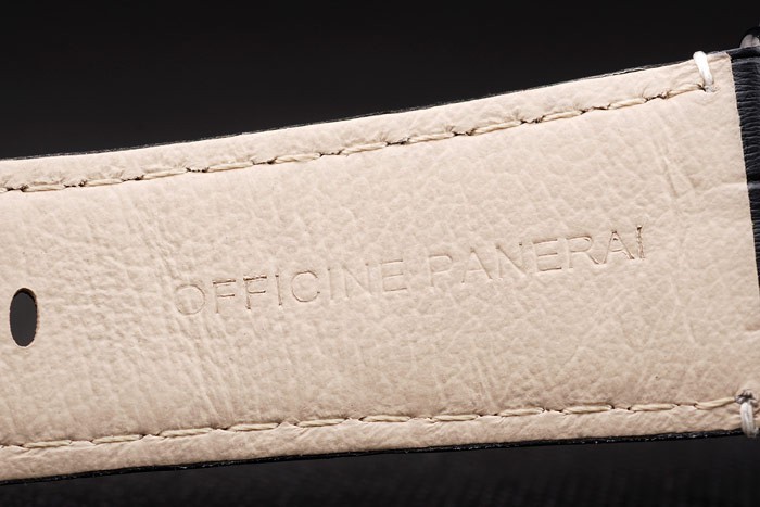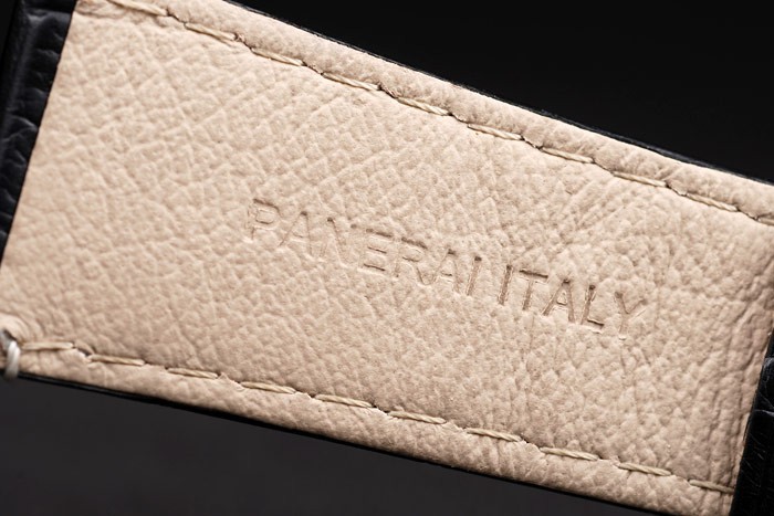 イオンメッキステンレススチールケース:ホワイトステッチと熱とブラッククロコダイルレザーストラップがでワークショップパネライイタリアスタンプとイオンメッキフックバックル留め金をエンボス加工パネライ彫刻