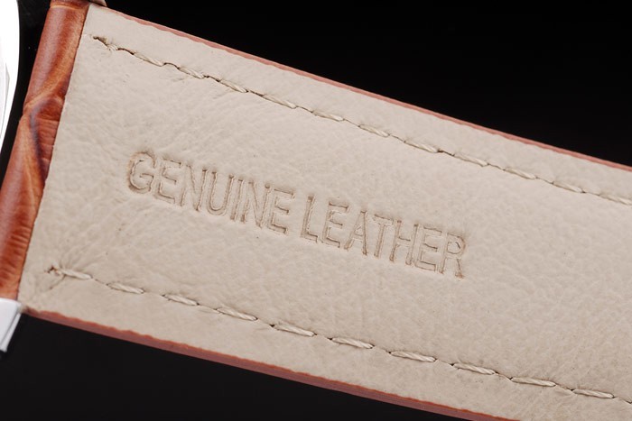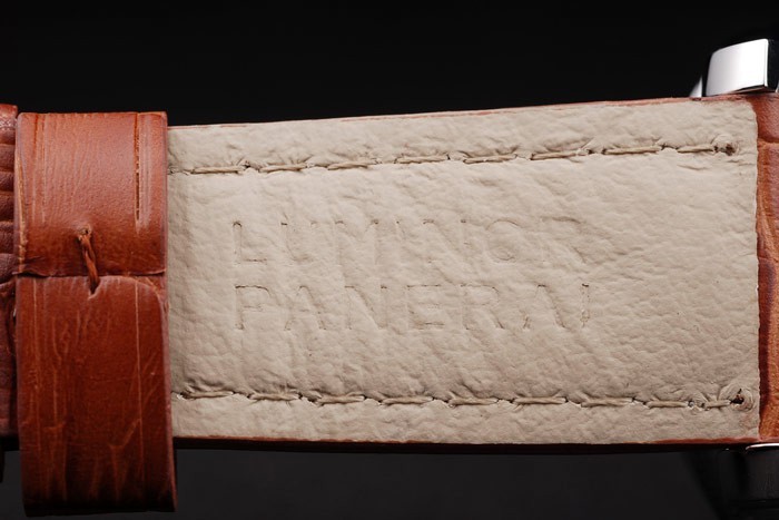 :ホワイトステッチと熱とブラウンのレザーストラップは、ルミノールパネライスタンプをエンボス加工し、パネライ彫刻