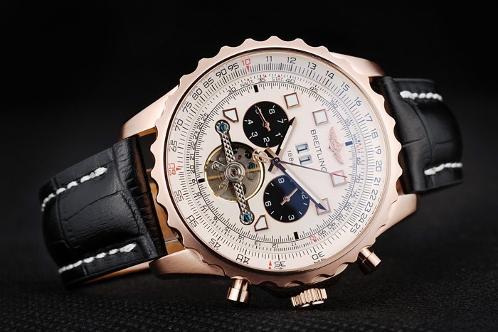 クラウン:ブライトリングのロゴとと18Kローズゴールドメッキカットワーク冠それのいずれかの側にある2つの小さなステンレススチールプッシュボタン冠はケース厚を