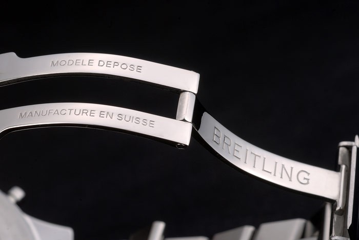 ブライトリングのロゴが刻印展開とクラスプ付スチールリンクブレスレットポリッシュステンレススチールカットワークベゼルタキメーター