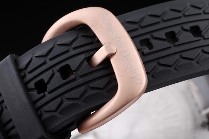 18Kローズゴールドケース:タイヤの溝のブラックラバーストラップ熱でポルシェスタンプをエンボス加工し、ブレスレットの長さ