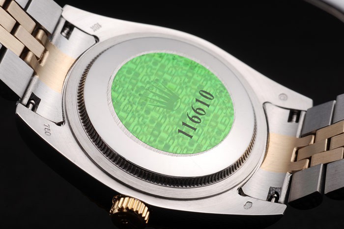 バック:ステンレススチールプッシュでケースの背面の緑ロレックスのロゴスタンプ