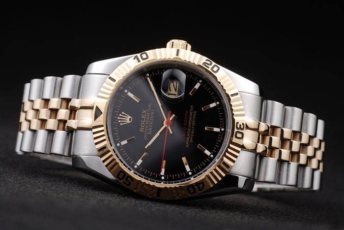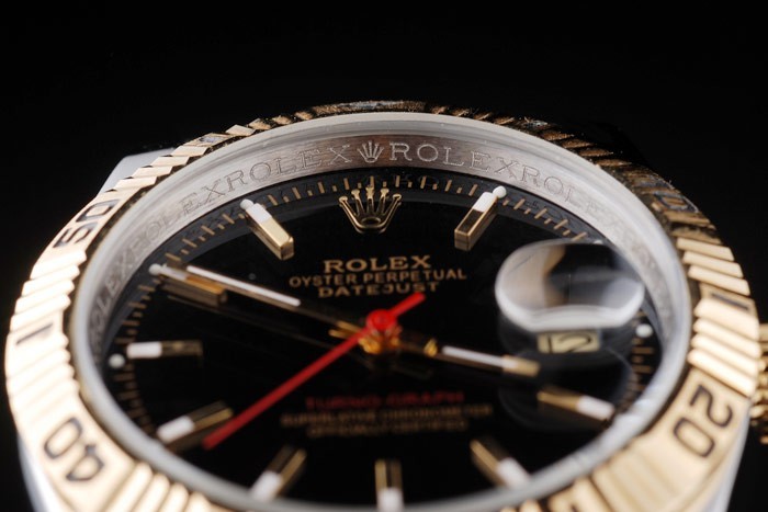 ロレックスのロゴを表示隠されたクラスプを刻まれた黒い分マーカーと18Kイエローゴールドメッキステンレス鋼のカットワークのベゼル