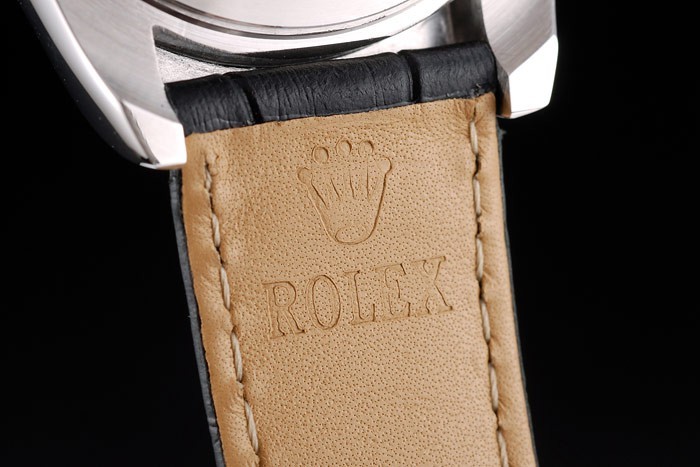 上にロレックスのロゴが刻まれたステンレススチール展開クラスプと黒のワニ革ストラップをエンボス加工ポリッシュステンレススチールベゼルタキメーター