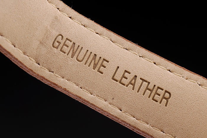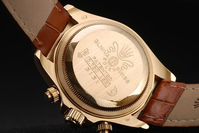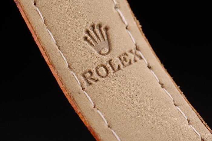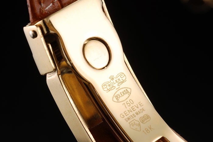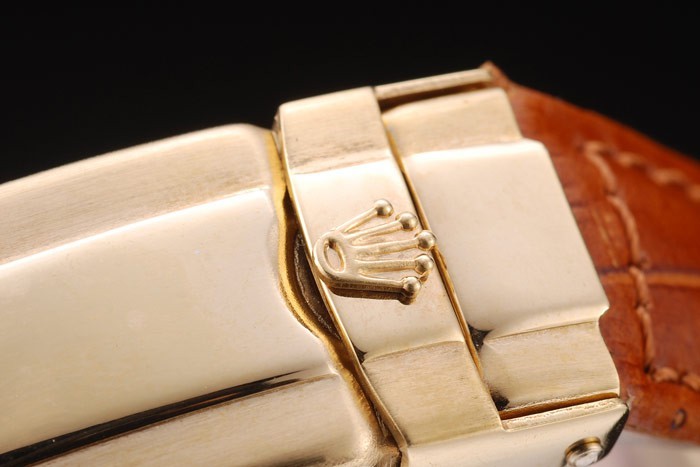 上にロレックスのロゴが刻まれイエローゴールドの展開クラスプと茶色のワニ革ストラップをエンボス加工:ベゼル