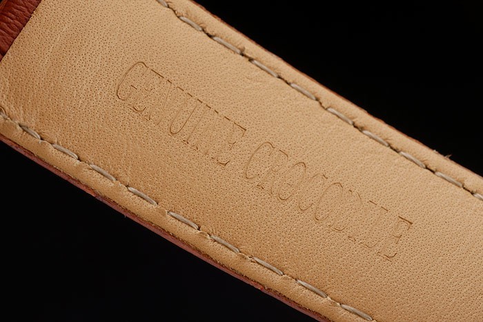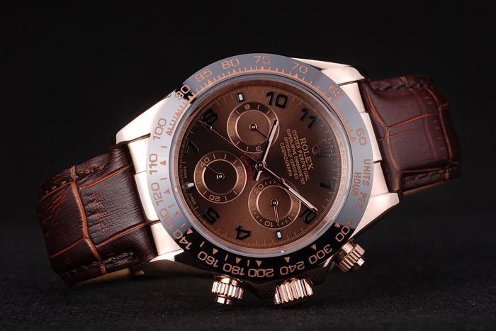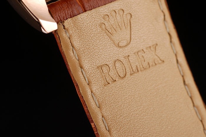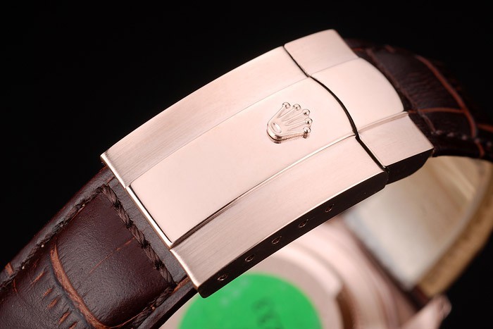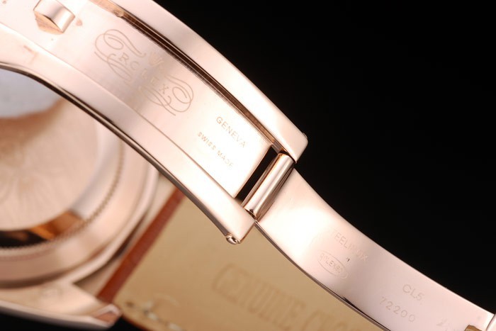 上にロレックスのロゴが刻まローズゴールドの展開クラスプと茶色のワニ革ストラップをエンボス加工しましたタイプ:クロコダイル
