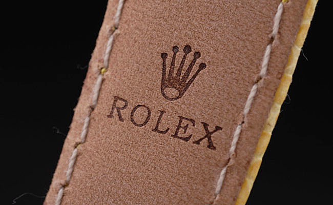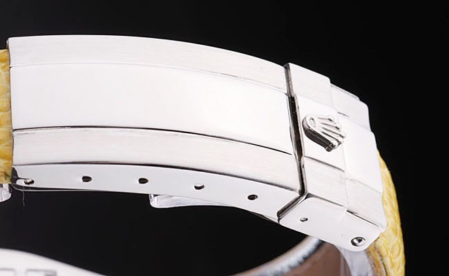 ロレックスのロゴを表示するステンレス鋼の展開クラスプと黄色のヘビ革ストラップ:ベゼル
