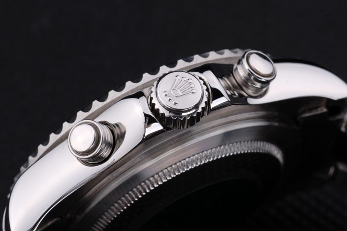 時間マーカーとポリッシュステンレススチールロレックスの王冠のロゴラウンドでカットワークを刻印それのいずれかの側にプッシュボタン冠はケース厚を