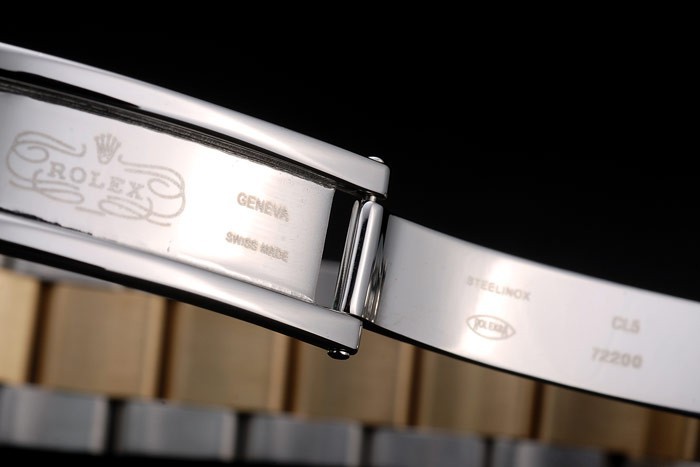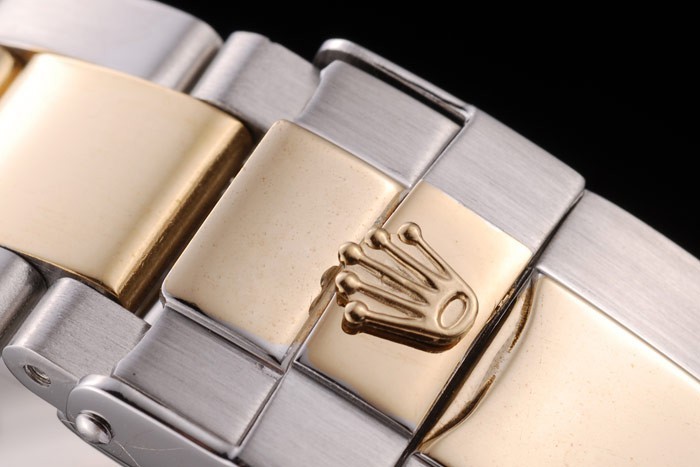 上にロレックスのロゴが刻印展開クラスプ金メッキとつや消しステンレススチールリンクブレスレットゴールドのインデックスとアラビア数字分マーカー