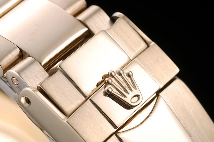 上にロレックスのロゴが刻印展開クラスプと18Kイエローゴールドメッキステンレススチールリンクブレスレットゴールドのインデックスとアラビア数字分とブラウンセラミックカットワークのベゼルマーカー