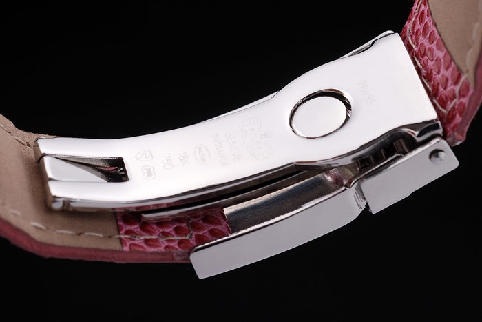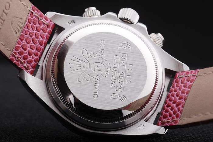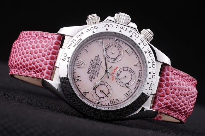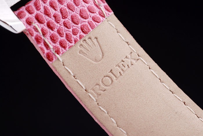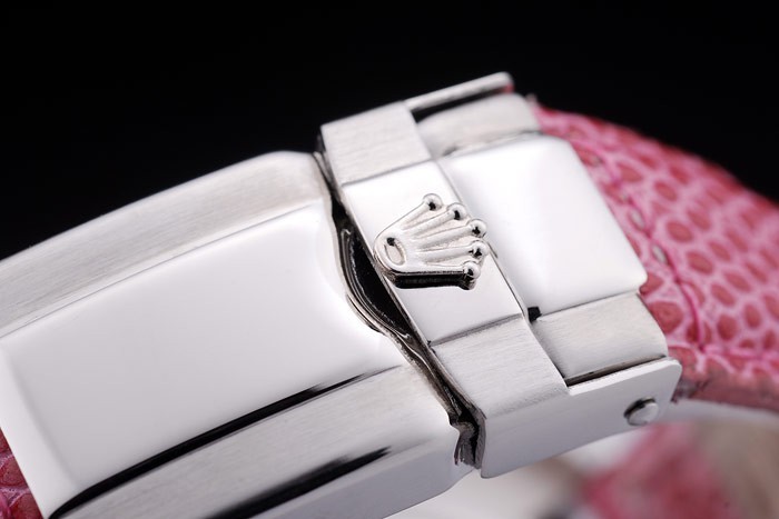 時間マーカーあたりの単位で研磨されたステンレススチール製のベゼルロレックスとロゴの熱がロレックスのロゴとピンクの蛇革ストラップは、ブレスレットの長さ